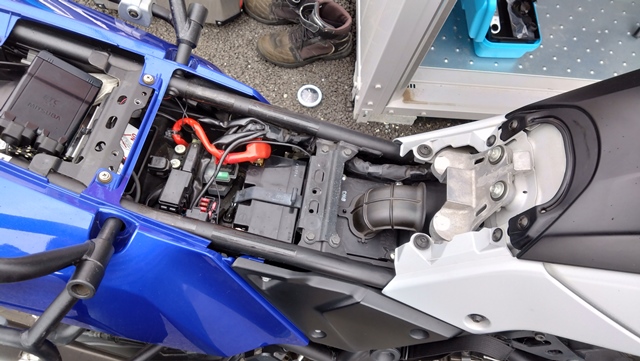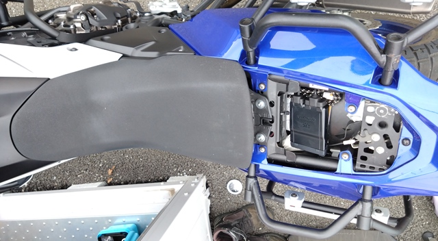 まずはリアシートを外し、シート裏に装着されている純正工具(六角棒スパナ4mm)を使用してライダーシートを取り外す。外す際は少し上に持ち上げた後、後ろに引っ張ると外れる。ライダーシートの下部が車体に当って傷が付かないように注意したい。