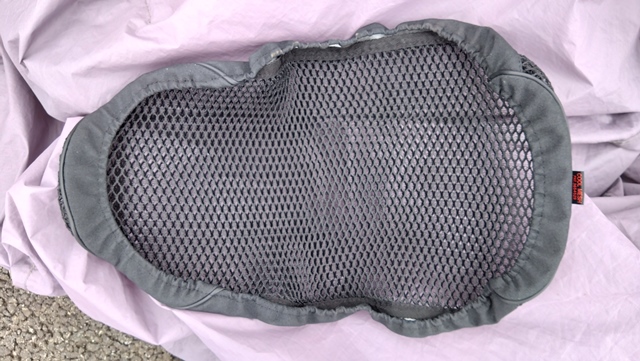 ライダーシートを裏返し、シートカバーをはめ込んでいく。赤文字で「COOL MESH」と書いてある方が後ろ側になる。