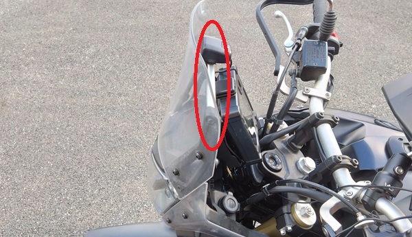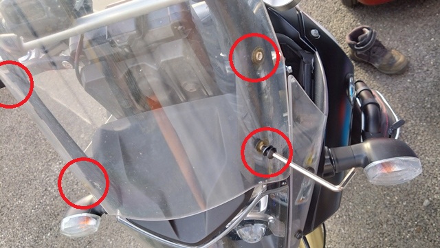 純正のフロントスクリーンの場合は、画像赤〇印の4か所にあるネジを六角棒スパナを用いて取り外す。六角棒スパナはテネレ700のシート下にある車載工具の中に入っているので、それを使用することもできる。