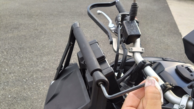 フロントスクリーン周りの掃除が終わったので、純正のバーを取り外す。工具は太めの六角棒スパナが必要だ。私のテネレ700ではネジの固着などは無く、ここまでどのネジもスムーズに外すことができた。ネジ類は全て再利用するので、無くさないように気を付けたい。