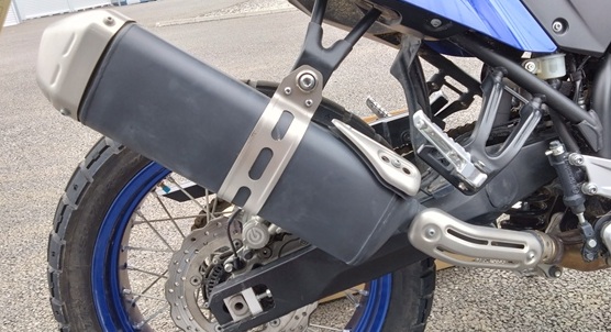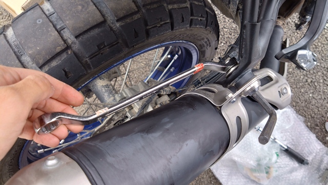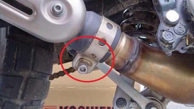 本体とテールパイプが繋がったら、次に車体とマフラー本体を固定する。付属品のネジ、バンドを使用して、まず先にマフラーにバンドを軽く通して、下側のボルトを仮止めする。次に、画像のように車体とマフラーを上側のボルトで固定し、六角棒レンチとスパナでしっかりと固定する。