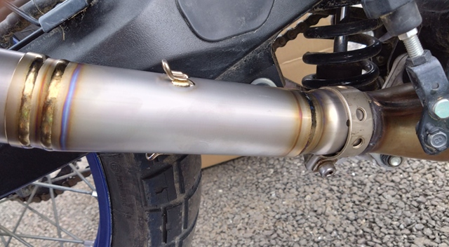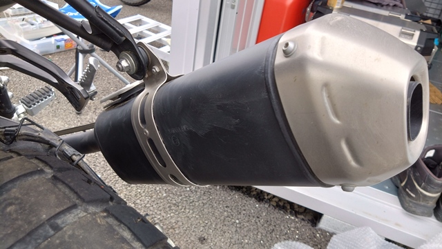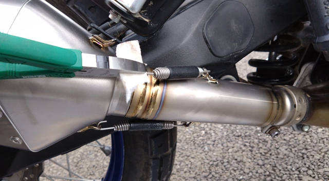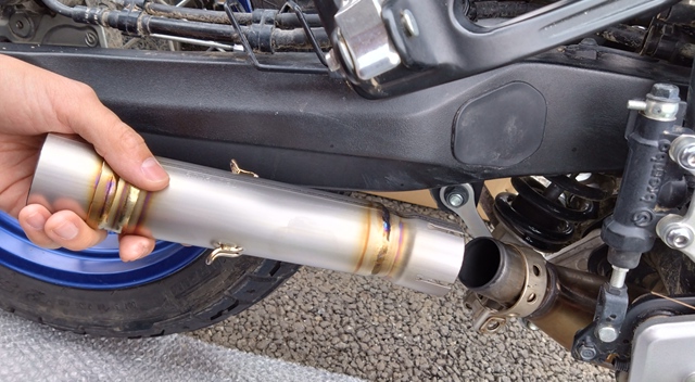 まずは、画像のようにマフラー本体をテールパイプの端部に差し込むように取り付ける。