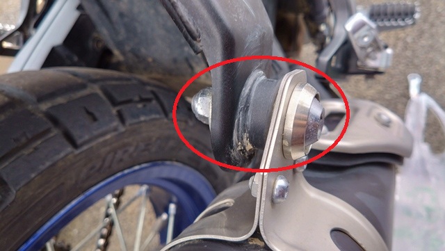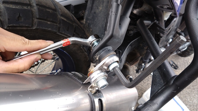 まずは純正マフラーを取り外すため、画像赤〇2か所のボルトネジを六角棒ナットとメガネレンチ等を使って緩める。テネレ700はまだ新しいバイクなので、ネジの固着はなくスムーズに外れた。