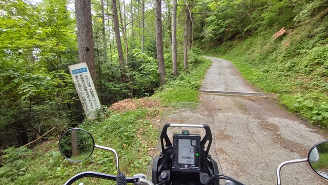 林道高瀬線は約16kmのロングダートで、初めからダートなのが良い。入口の看板は朽ち果てて落下しているが、文字は確認できる。