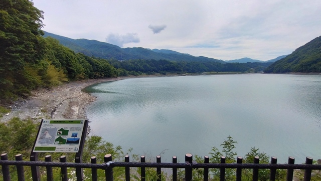 次のダート林道である「林道高瀬線」へ向かうため、湖畔にキャンプ場がある小さな湖、千代田湖方面に走っていく。