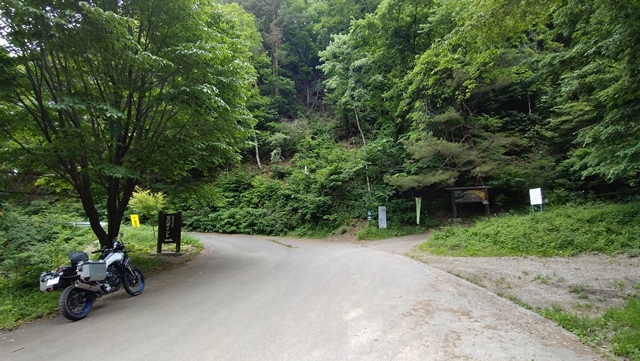 ダート区間では特に他者(車)や野生動物とも出会うことなく、順調に走り終えた。ゴルフ場の裏の道に出たところが坂室林道の終点となる。