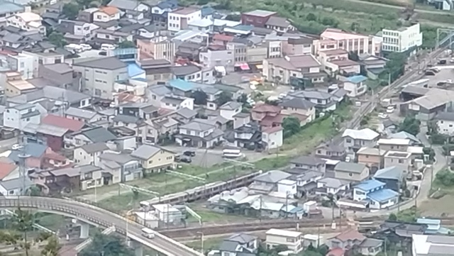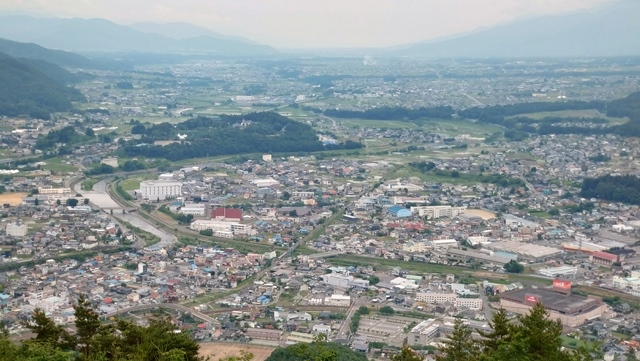 山頂に着くと、辰野町の風景を一望できる絶景が広がっていた。JR飯田線の鉄道が走っている姿も見ることができる。自転車のスタンドがあったので、マウンテンバイクでここを目指す強者もいるのだろう。
