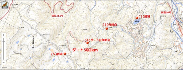 国道20号は市街地も近くて交通量が多いが、鏡湖方面への1.5車線の道に入ると一気に人気が無くなった。昭和の時代に建てられた別荘地があるため、ここまでの路面状況はアスファルト舗装で比較的良好だ。