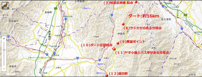 この林道には展望が開ける区間はあまり無く、確認できたのは1か所のみ。タイミングが悪く、先ほどのマウンテンバイク軍団が休憩していて停まれなかったので展望ポイントはスルー、写真は無い。※地図(9)付近の場所